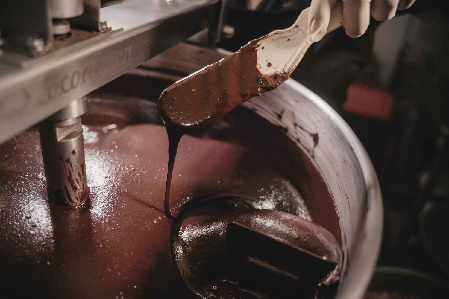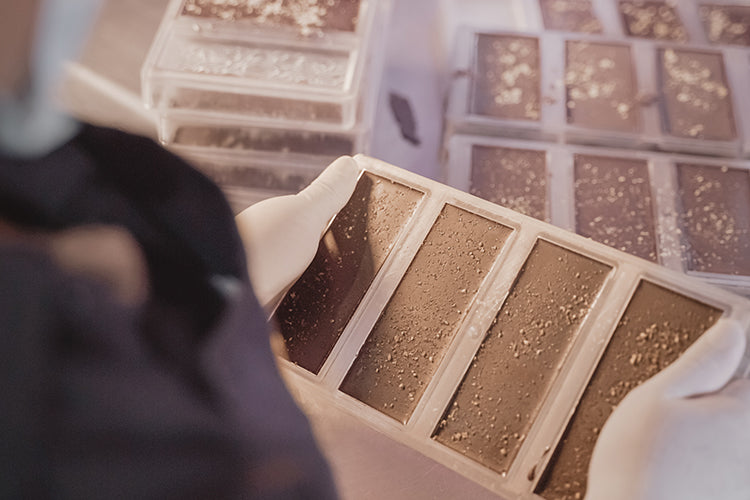 The chocolate is tempered through a heating and cooling process, resulting in the desired crystal formation in the chocolate bringing that gloss and snap found in high-quality chocolate bars.