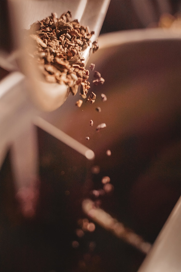 Cacao nibs, along with cane sugar and other ingredients, are loaded into a stone grinder and ground for 24-72 hours. This process reduces the particles to a smooth silk-like texture, smaller than 15 microns. The second step, called 'conching,' evaporates stronger flavors and brings the subtler notes into balance.